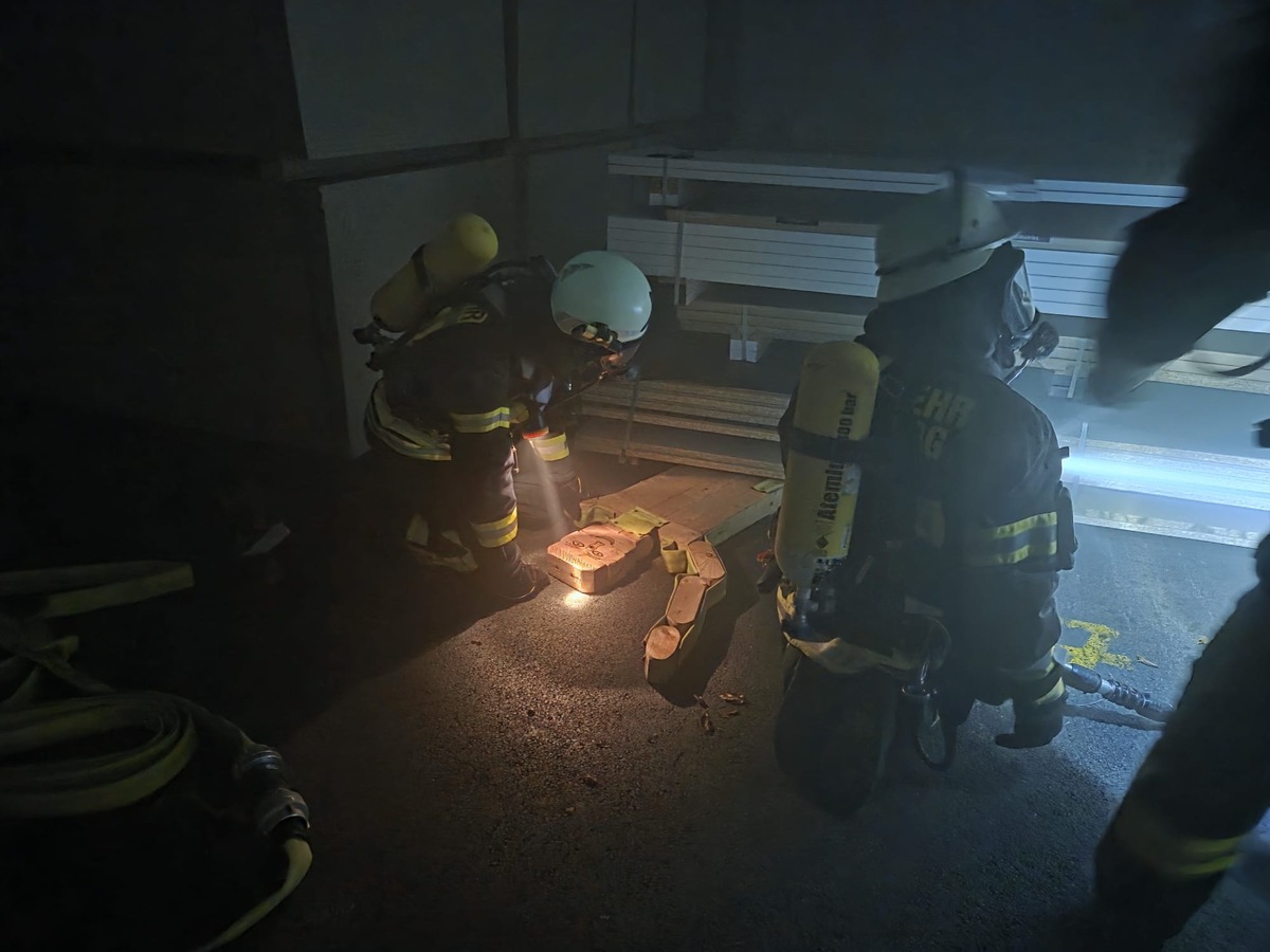 Vor Ort teilte der Einsatzleiter die Lage in drei Einsatzabschnitte auf: Menschenrettung, Brandbekämpfung und Riegelstellung zum Schutz der angrenzenden Produktionsanlagen. Ein Trupp unter Atemschutz wurde zur Menschenrettung eingesetzt, um die unter der Palette eingeklemmte Person mit technischem Gerät zu befreien. Zeitgleich ging ein weiterer Trupp unter Atemschutz zur Brandbekämpfung in die Lagerhalle vor. Durch das schnelle und koordinierte Vorgehen konnte das Feuer zügig unter Kontrolle gebracht werden. Parallel dazu wurden Lüftungsmaßnahmen durchgeführt, um die Halle rauchfrei zu bekommen.