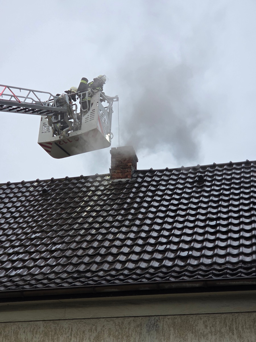 Der zwischenzeitlich eingetroffene Schornsteinfeger begutachtete die Maßnahmen der Feuerwehr.