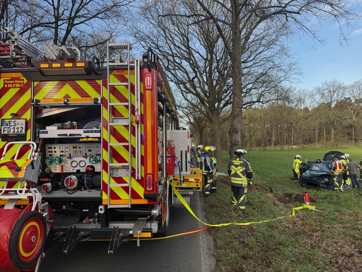 An der Einsatzstelle war ein Pkw mit einem Baum kollidiert, der Pkw schleuderte anschließend in das angrenzende Feld. Eine schwerverletzte Person wurde durch die Feuerwehr und den Rettungsdienst medizinisch erstversorgt. Um die Rettung aus dem Pkw zu ermöglichen, wurde die Fahrertür mit hydraulischem Rettungsgerät entfernt. Parallel dazu wurde der Brandschutz sichergestellt und die Fahrzeugbatterie abgeklemmt. Die Patientin wurde zur weiteren Behandlung in ein umliegendes Krankenhaus gebracht.