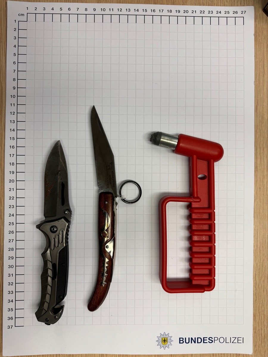Am 2. Januar stellten Einsatzkräfte der Bundespolizei im Hauptbahnhof Gelsenkirchen mehrere Personen fest, die verbotene Gegenstände bei sich führten. Gegen 12:45 Uhr kontrollierten die Beamten zwei gemeinsam unterwegs gewesene Jugendliche. Ein 16-jähriger deutscher Staatsangehöriger führte einen Nothammer in seiner Tasche mit. Er gab an, diesen zur Selbstverteidigung bei sich zu tragen. Zudem führte ein 17-jähriger Syrer ein Einhandmesser im Hosenbund mit sich. Beide Personen wurden über den jeweiligen Tatvorwurf belehrt, machten jedoch keine weiteren Angaben. Der Nothammer und das Messer wurden beschlagnahmt. Nach Abschluss der polizeilichen Maßnahmen leiteten die Einsatzkräfte ein Ermittlungsverfahren gegen die Jugendlichen aus Gladbach und Gelsenkirchen ein und entließen sie vor Ort. Gegen 15:20 Uhr desselben Tages stellten die Einsatzkräfte einen 34-jährigen deutschen Staatsangehörigen fest, der ebenfalls ein Einhandmesser im Hosenbund mitführte. Das Messer wurde beschlagnahmt. Der Mann äußerte sich nach erfolgter Belehrung nicht zum Tatvorwurf. Nach Abschluss der Maßnahmen wurde der Gelsenkirchener vor Ort entlassen.