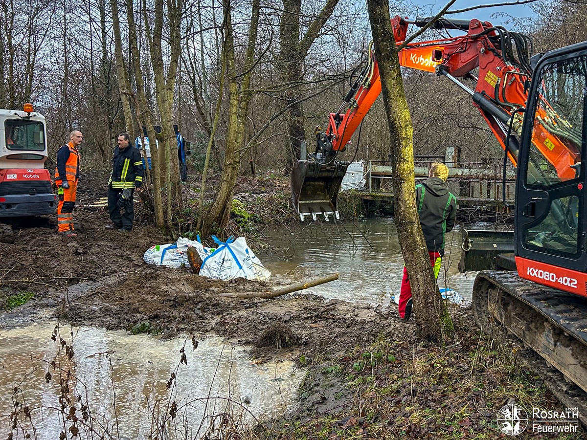 Die Einsatzkräfte der Feuerwehr Rösrath prüften gemeinsam mit einem Fachberater des Technischen Hilfswerks verschiedene Einsatzmöglichkeiten. Zunächst wurden mit Folie verkleidete Paletten in den beschädigten Bereich des Wehrs eingebracht. Parallel dazu bereitete die Feuerwehr gemeinsam mit den Stadtwerken Rösrath den Einbau sogenannter Faschinen vor. Dabei handelt es sich um lange Bündel aus Gehölzmaterial.