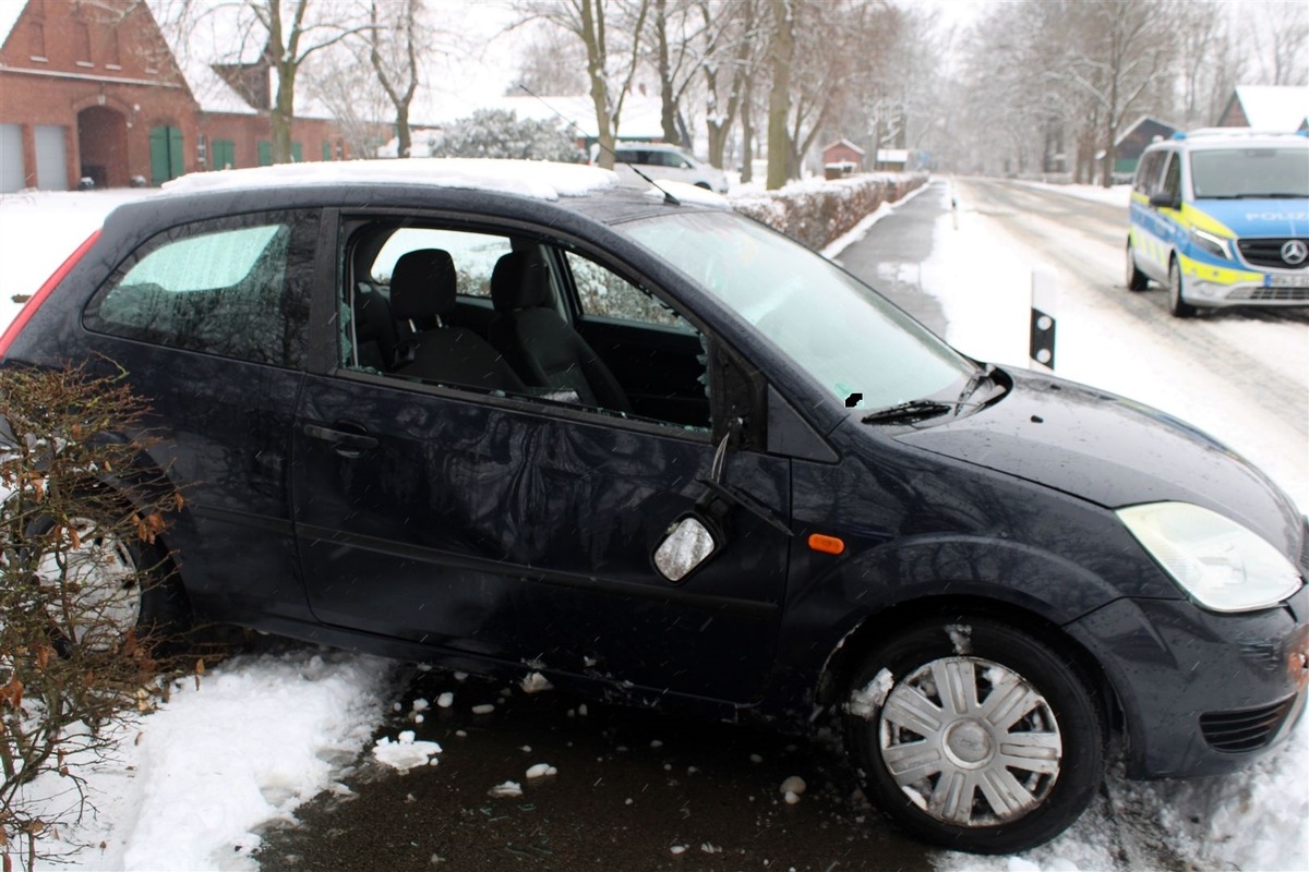 Demnach befuhr ein 44-Jähriger mit seinem Ford gegen 11:30 Uhr die Minderheider Straße in Fahrtrichtung Hille. In einer leichten Linkskurve verlor der Mindener auf der schneebedeckten Fahrbahn die Kontrolle über seinen Fiesta und kam nach links von der Straße ab. Hier kollidierte er zunächst mit einer Grundstücksmauer. Durch die Wucht des Aufpralls drehte sich der Wagen um die eigene Achse und stieß mit einer Fußgängerin zusammen, die an der dortigen Bushaltestelle wartete. In der Folge rutschte das Auto weiter und kam in einer Grundstückshecke zum Stehen. Die 53-Jährige zog sich durch den Zusammenstoß leichte Verletzungen zu. Sie wurde zwecks ambulanter Behandlung dem Klinikum Minden mittels Rettungswagen zugeführt. Der Pkw war nicht mehr fahrbereit und musste abgeschleppt werden.