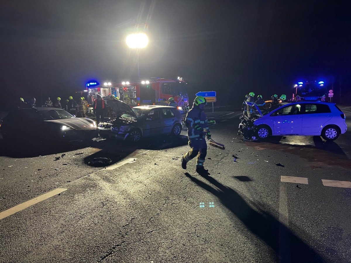 In dem Kreuzungsbereich der Auf- und Abfahrt zur B64 kam es zu einem Verkehrsunfall zwischen zwei PKW. Durch den Aufprall kollidierte einer der beiden PKW mit einem an der Kreuzung stehenden dritten PKW. Durch den Unfallmechanismus wurde eine Person schwer verletzt, zwei weitere Personen leicht.