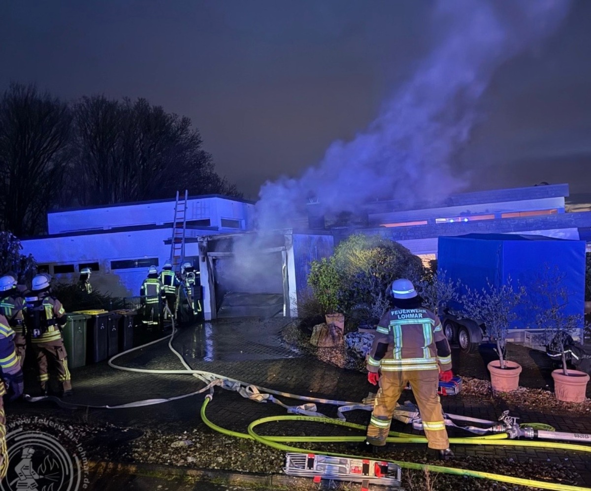 Einer der B-Dienste der Freiwilligen Feuerwehr der Stadt Lohmar war zeitnah vor Ort und konnte die Meldung bestätigen und erhöhte das Alarmstichwort, da das Feuer sich auf das Wohngebäude auszubreiten drohte.