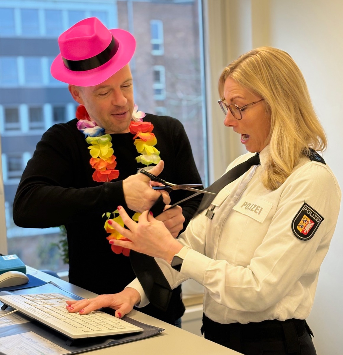 Heute kam es in den Diensträumen der Polizeidirektion Kiel zu einem vorhersehbaren, aber dennoch nicht ganz sch(m)erzfreien Einsatz: Eine Krawatte fiel dem närrischen Brauchtum zum Opfer.