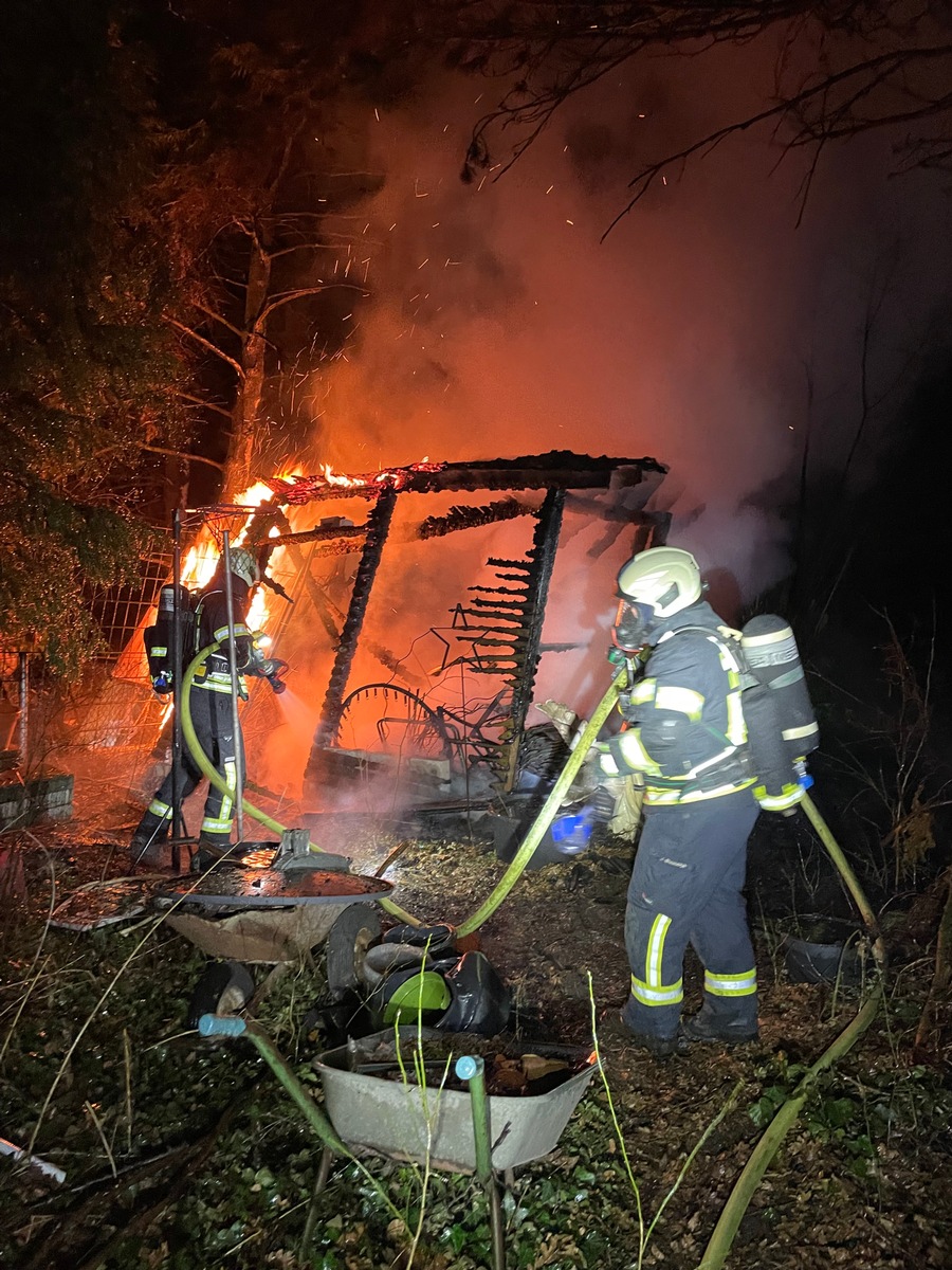 Am frühen Dienstagmorgen entdeckten zwei Passanten im Ortsteil Hiesfeld in der Nähe Ihres Wohnortes einen starken Feuerschein und Funkenflug und alarmierten die Feuerwehr. Aufgrund der zunächst unklaren genauen Lage der Einsatzstelle gestaltet sich die Erkundung für die Einsatzkräfte trotz der bereits weiten Entwicklung des Feuers schwierig. Nachdem der Ort und die genaue Lage festgestellt waren, wurde durch die Feuerwehr ein zweiseitiger Löschangriff unter schwerem Atemschutz durchgeführt, um eine weitere Ausbreitung der Flammen zu verhindern. Insgesamt standen zu diesem Zeitpunkt jedoch bereits zwei Gartenhütten in Vollbrand und das Feuer hatte weiterhin auf die umgebende Vegetation und einen großen Brennholzstapel übergegriffen. An den beiden Schuppen entstand ein Totalschaden. Menschen oder Tiere kamen nicht zu Schaden. Durch die großen Mengen an gelagertem Holz und Brandgut zogen sich die Nachlösch- und Kontrollarbeiten noch bis in die frühen Morgenstunden hin, da das Brandgut in Handarbeit auseinandergezogen und abgelöscht werden musste, um Glutnester zu beseitigen. Erst gegen 4 Uhr war nach der Wiederherstellung der Einsatzbereitschaft auf der Hauptwache der Einsatz für die Einheiten Hiesfeld, Stadtmitte und Hauptamt beendet. Hervorzuheben ist auch hier wieder der engagierte Einsatz der ehrenamtlichen Kräfte der freiwilligen Feuerwehr, die auch wochentags und zu nachtschlafender Stunde für den Schutz der Dinslakener Bürgerinnen und Bürger bereitstanden.
