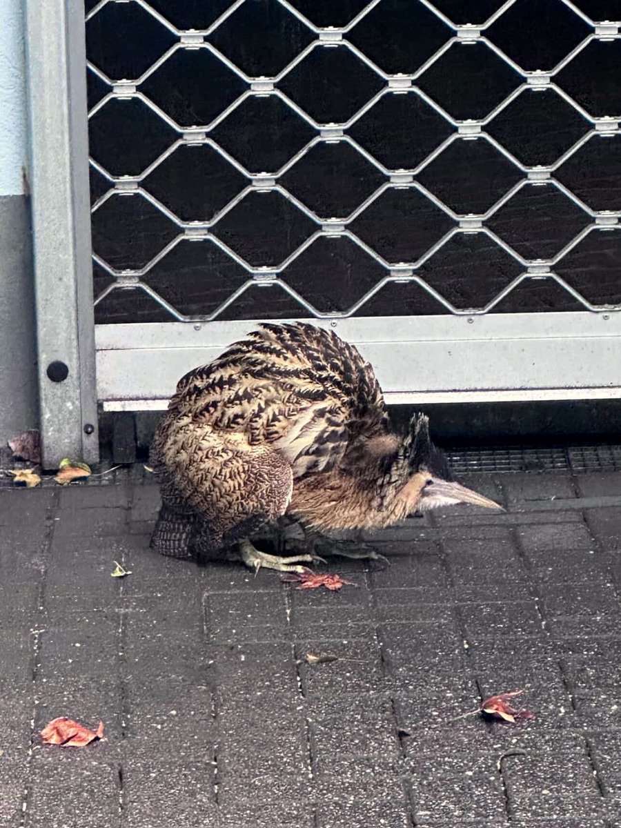 Die alarmierten Kräfte trafen das Tier unmittelbar vor einem Garagentor an und konnten es als Rohrdommel identifizieren - eine seltene und gefährdete Vogelart. Deren natürliches Habitat sind Schilfbereiche und die Rheinauen - und eher weniger der gepflegte Garagenhof mit Betonoptik.