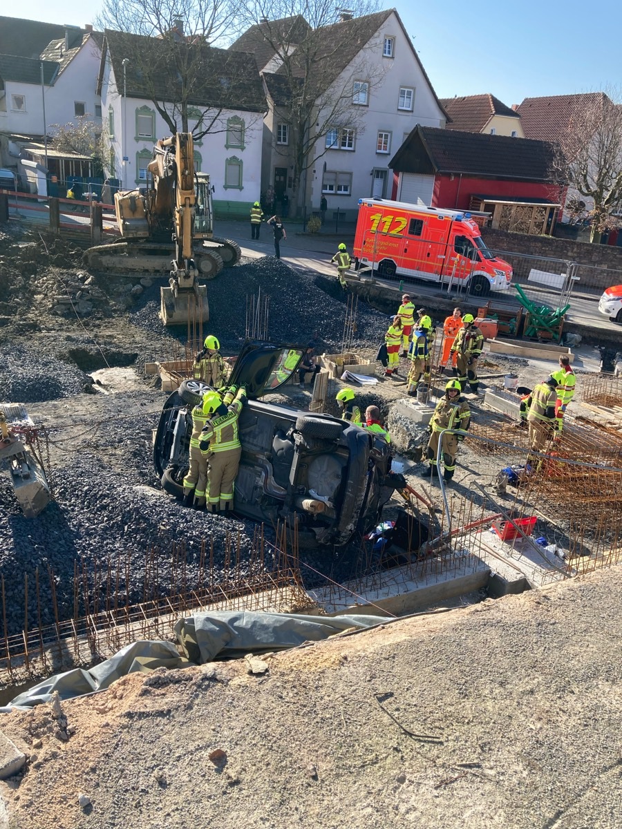 Hinter dem Bauzaun befand sich ein etwa drei Meter tiefer Abhang, den das Fahrzeug rückwärts hinabstürzte. Der Pkw kam auf der Seite zum Liegen.