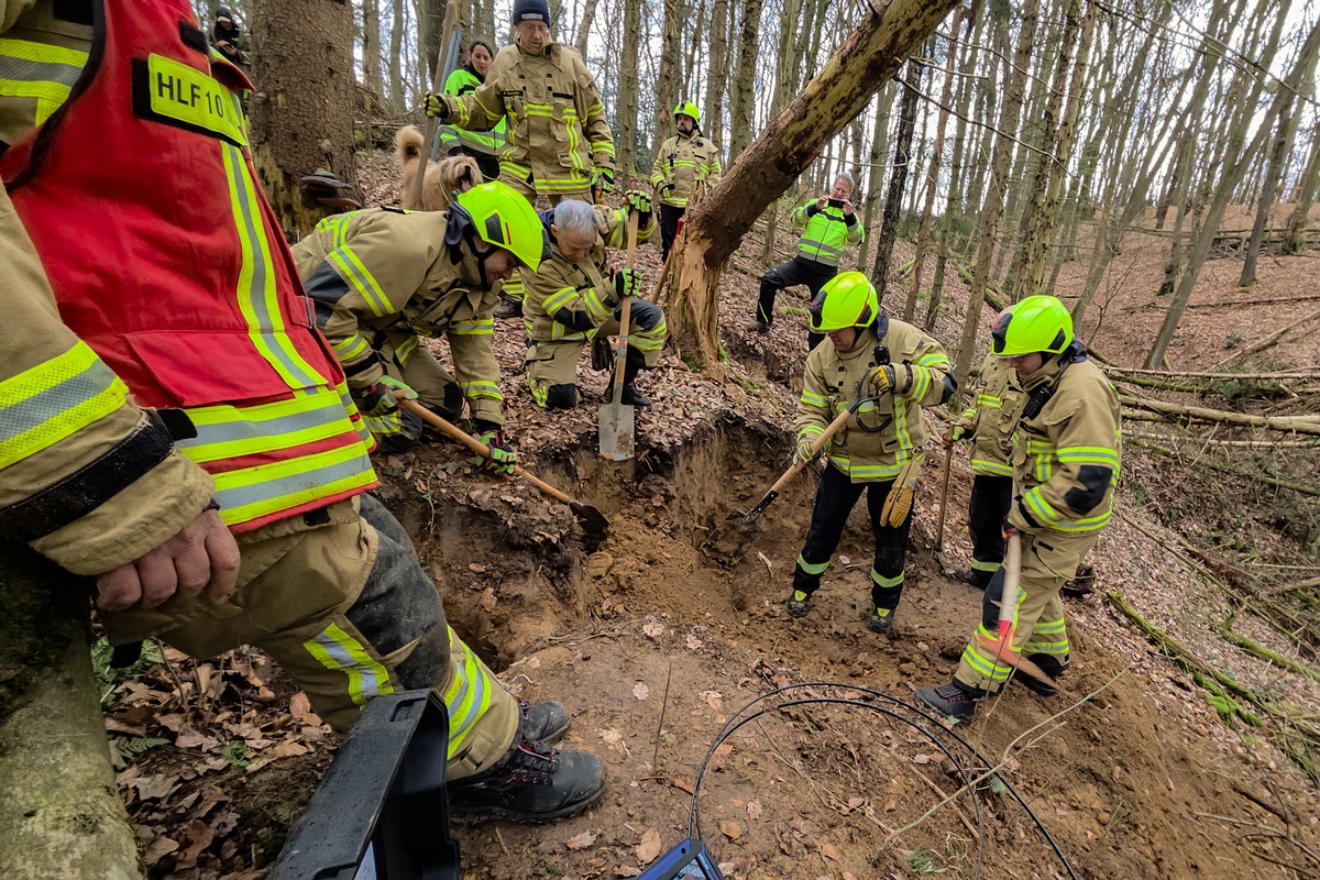 Am nächsten Tag (13.03.2026) setzen die Tierretter erneut ihre Suchhunde ein, um nach dem verschwundenen Hund zu suchen. Nach einiger Zeit schlugen die Hunde am Eingang eines alten Fuchsbaus an und aus diesem war auch ein leises Winseln zu hören. Daraufhin alarmierten die Tierretter gegen 11:30 Uhr die Feuerwehr Wachtberg.