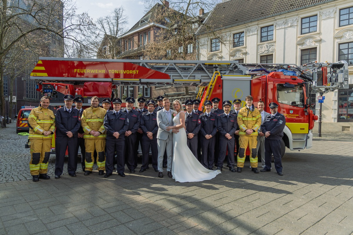 Ralf ist stellvertretender Löschzugführer und Führungskraft bei der Feuerwehr Tönisvorst im Löschzug St. Tönis. Darüber hinaus ist er einer der Gründungsmitglieder der Jugendfeuerwehr im Jahr 1994 und wurde letztendlich 1997 in den aktiven Dienst überstellt, wo er seither diverse Lehrgänge und Einsätze absolviert. Beruflich ist Ralf Sielaff als Schlosser in der Industrie tätig und bringt dort sein technisches Know-how ein. Kennengelernt haben sich Ralf und selbstständige Beraterin im Jahr 2019 und beschreiten seither den gemeinsamen Lebensweg. Auf einer Karnevalsparty fand durch einen Kameraden organisierte "Generalprobe der Eheschließung" statt. Was an diesem Abend noch als Spaß anzusehen war, wurde von beiden akribisch geplant und letztendlich in die Tat umgesetzt. Auch eine Abordnung der Feuerwehr hat es sich nicht nehmen lassen, das Brautpaar zu beglückwünschen. Nach dem standesamtlichen "Ja"-Wort ging es für beide durch den Schlauchbogen hin zur Drehleiter. Nach einer Fahrt in luftige Höhen über die Dächer von St. Tönis, gab es noch ein gemeinsames Fotoshooting mit den Anwesenden.